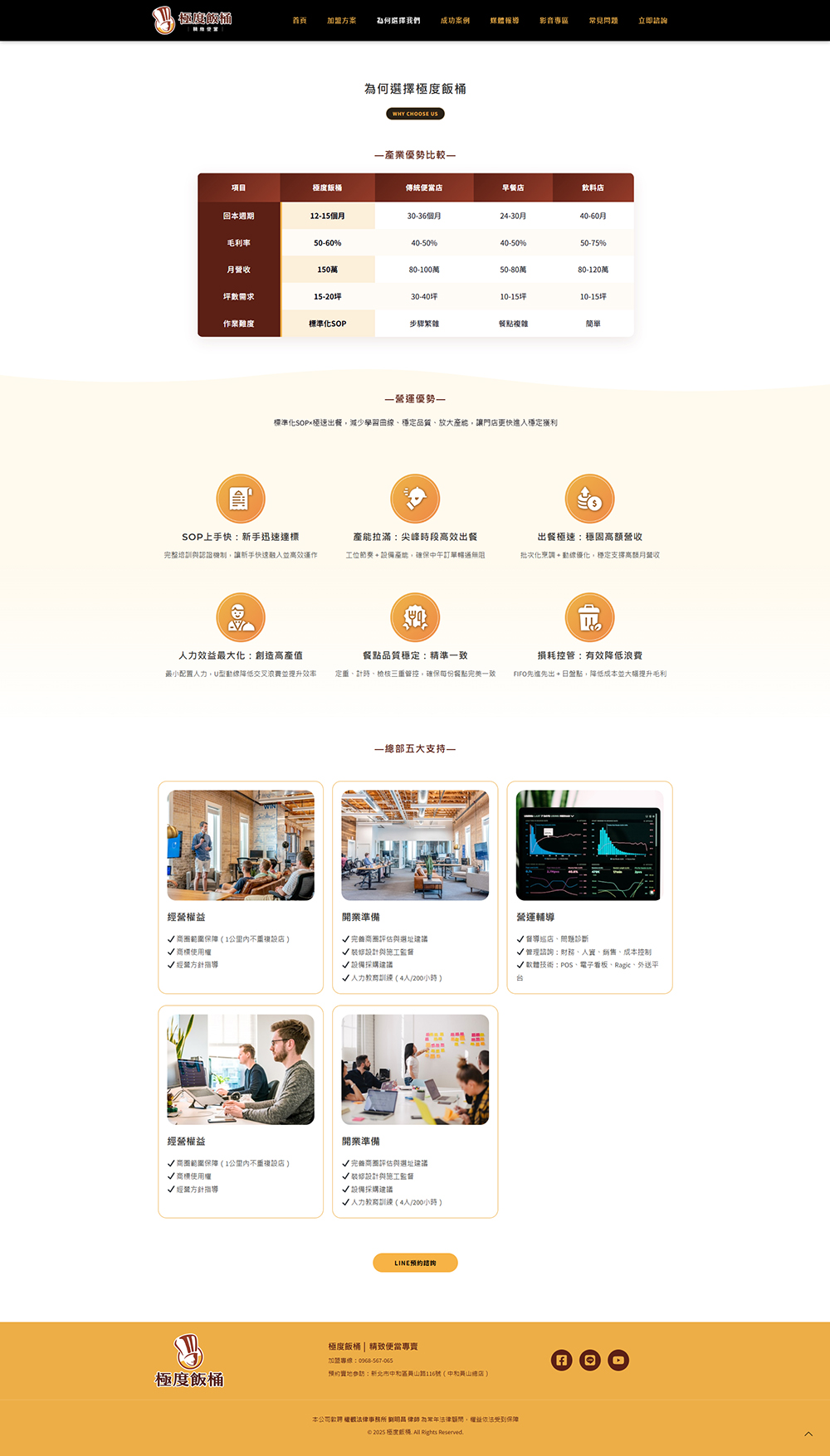 加盟方案與為何選擇我們: 透過視覺化圖表展示服務介紹與運營優勢,化繁為簡。