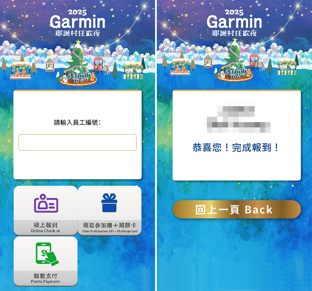 活動當晚,2500 名 Garmin 員工成了這座耶誕村的主角。藍訊科技量身打造的客製化手機選單成了大家的最佳導遊。從一進場的快速報到