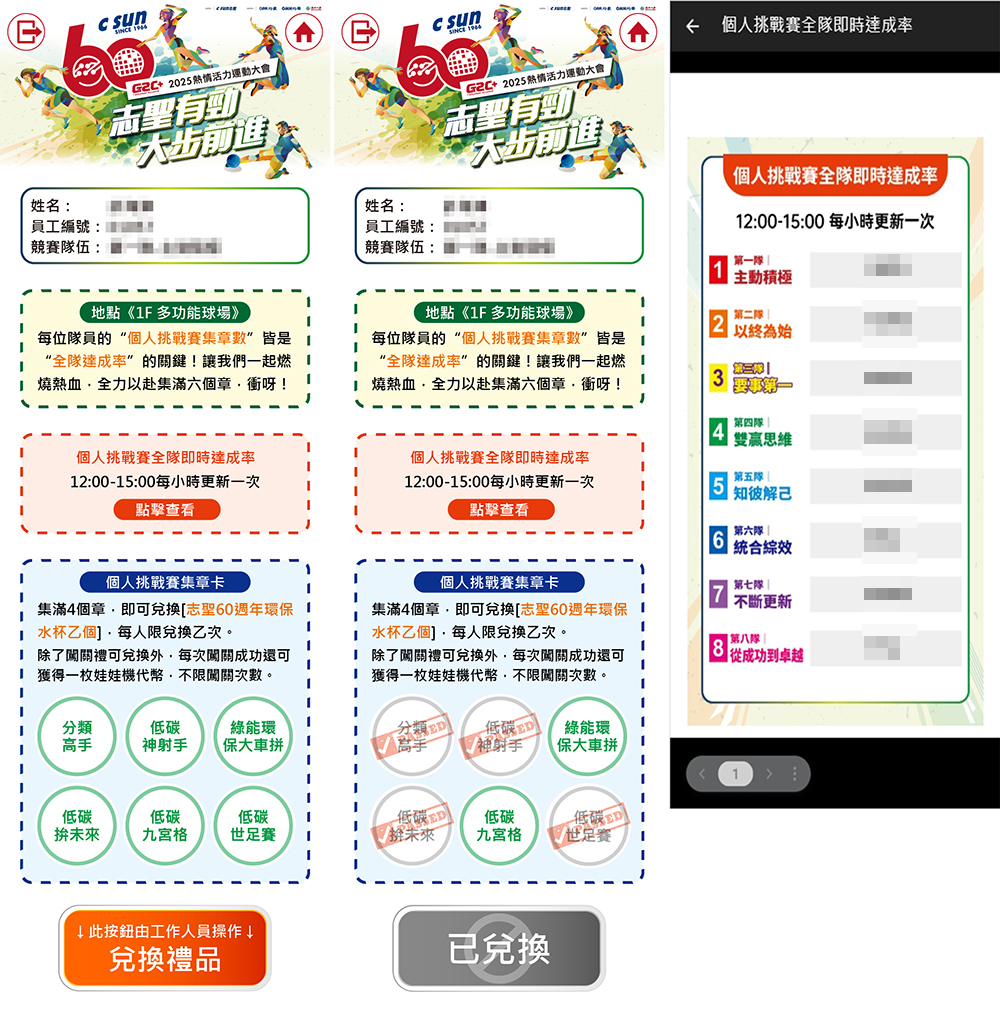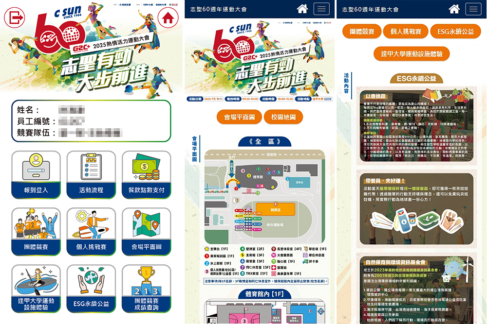 這套專屬數位平台將線上簽到、ESG 數位餐飲點數、活動時程、場地地圖及競賽相關內容等,全部集中在員工的手機內!參與者無需攜帶任何紙本資料,即可輕鬆導航全場,所有資訊隨點即得,極大提升了使用的便利性。