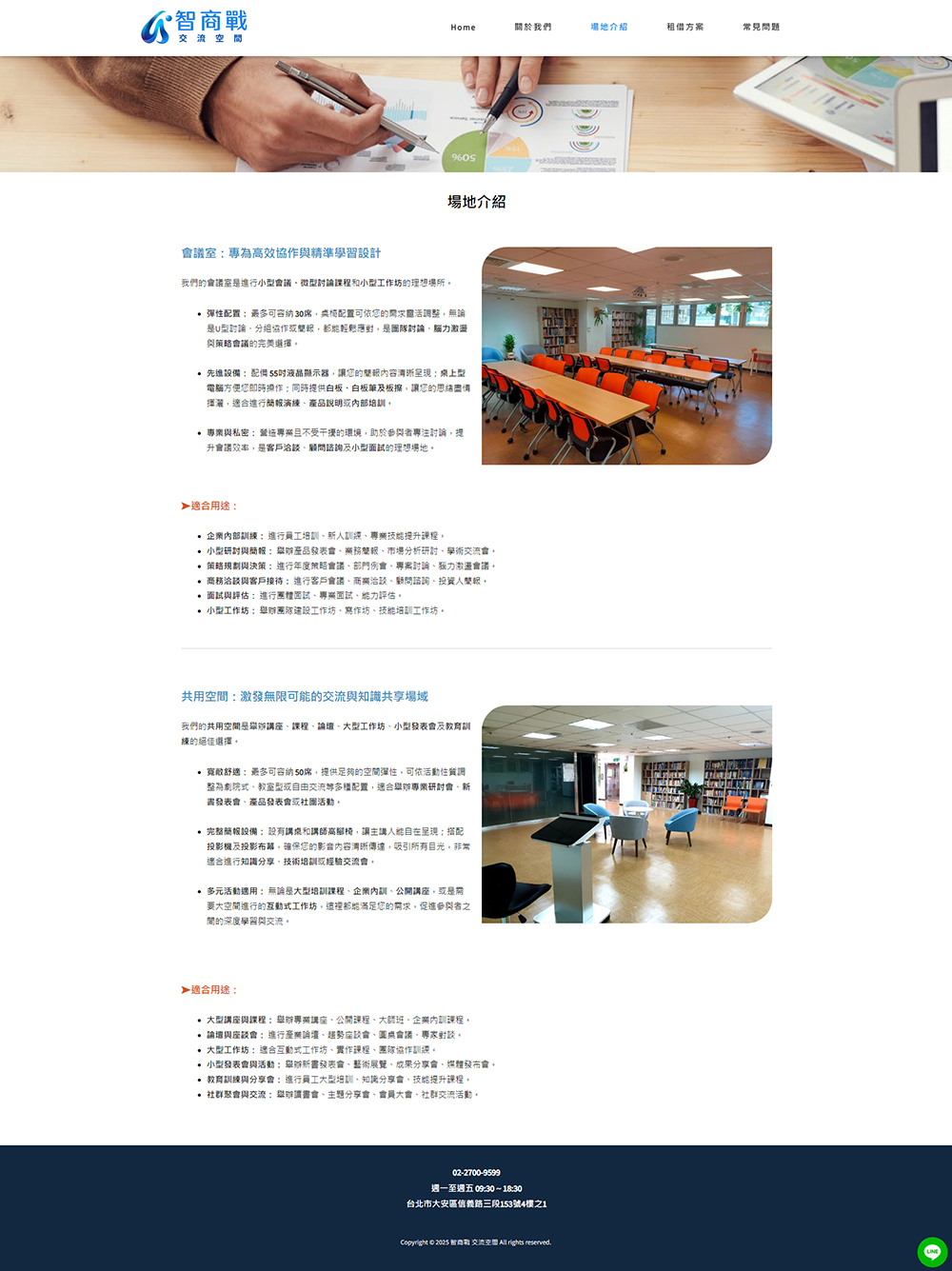 藍訊科技為民權202共享空間精心打造了具備RWD響應式設計的官方網站,確保使用者無論透過電腦或手機都能享有流暢的瀏覽體驗。網站內容涵蓋空間介紹、服務項目、預約資訊等,成為潛在客戶了解空間、進行預約的重要線上樞紐,大幅提升品牌專業度與資訊透明度。