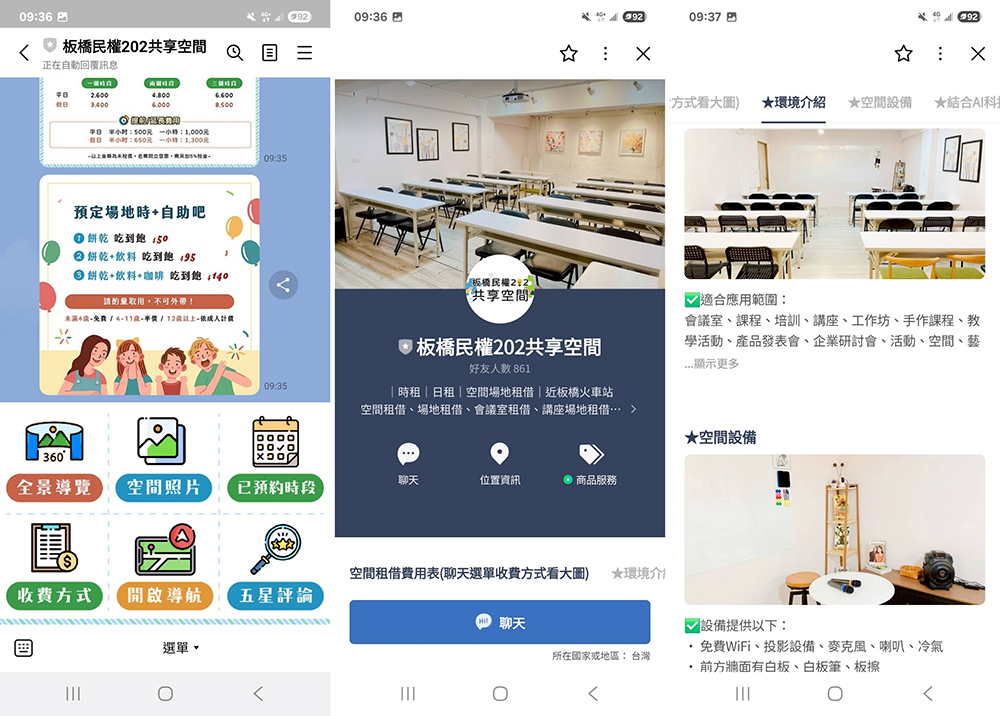 針對台灣市場特性,藍訊科技為民權202共享空間建置了功能完善的官方LINE@帳號。透過圖文選單設計、自動回應訊息與多頁訊息設定,不僅提供直觀便捷的服務入口,更能24小時不間斷地回應常見問題、推播最新活動資訊,實現與目標客群的精準行銷與個人化互動,有效促進會員經營和活動報名。
