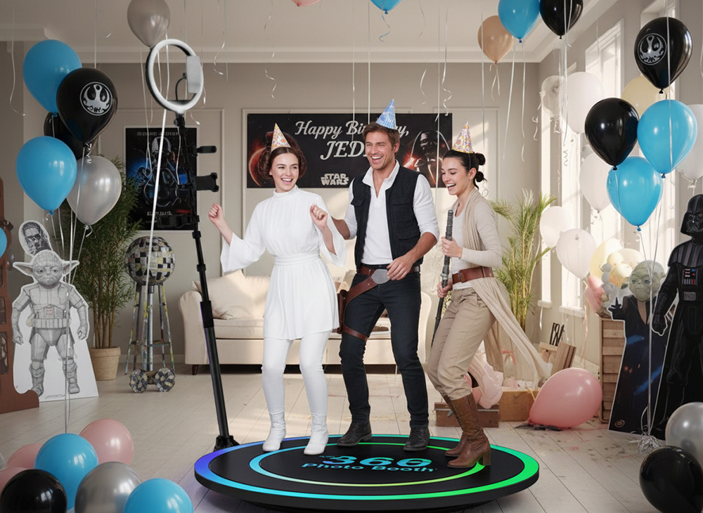 想舉辦一場星際大戰主題派對?我們的 360 Photo Booth 結合了創意道具與特效,讓「旋轉自拍神器」變身為科幻場景,為壽星與賓客打造如電影般的夢幻回憶。