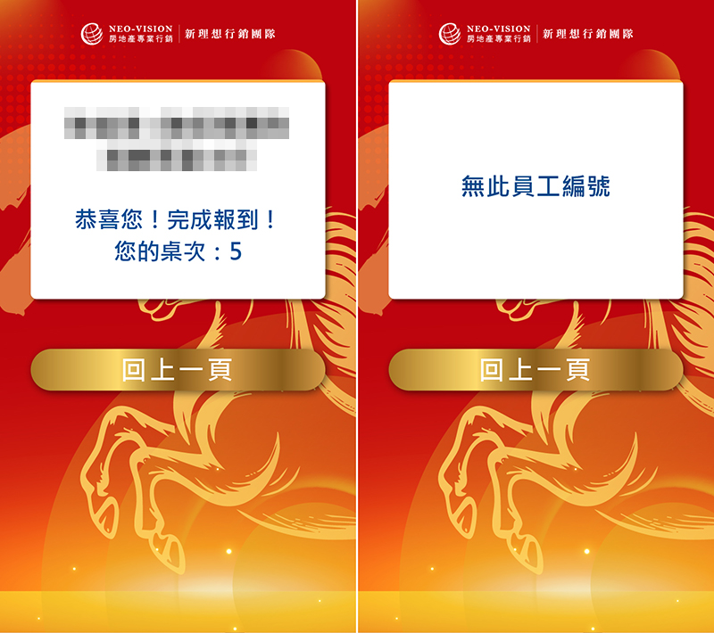 報到與桌次查詢: 員工只需輸入員工編號,即可快速完成線上自行報到並查詢自己的桌次號,簡化了入場流程。